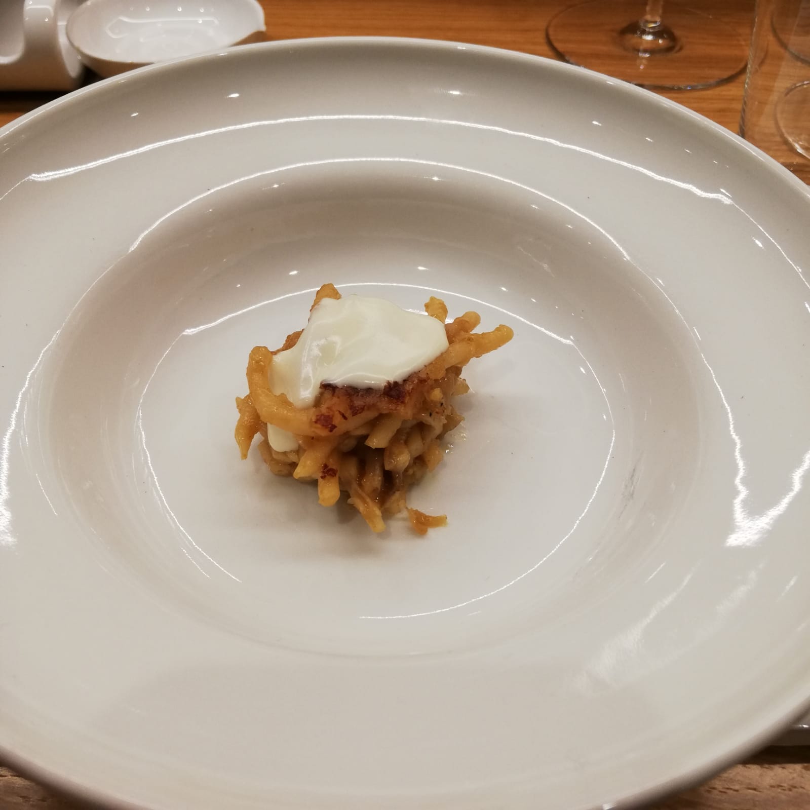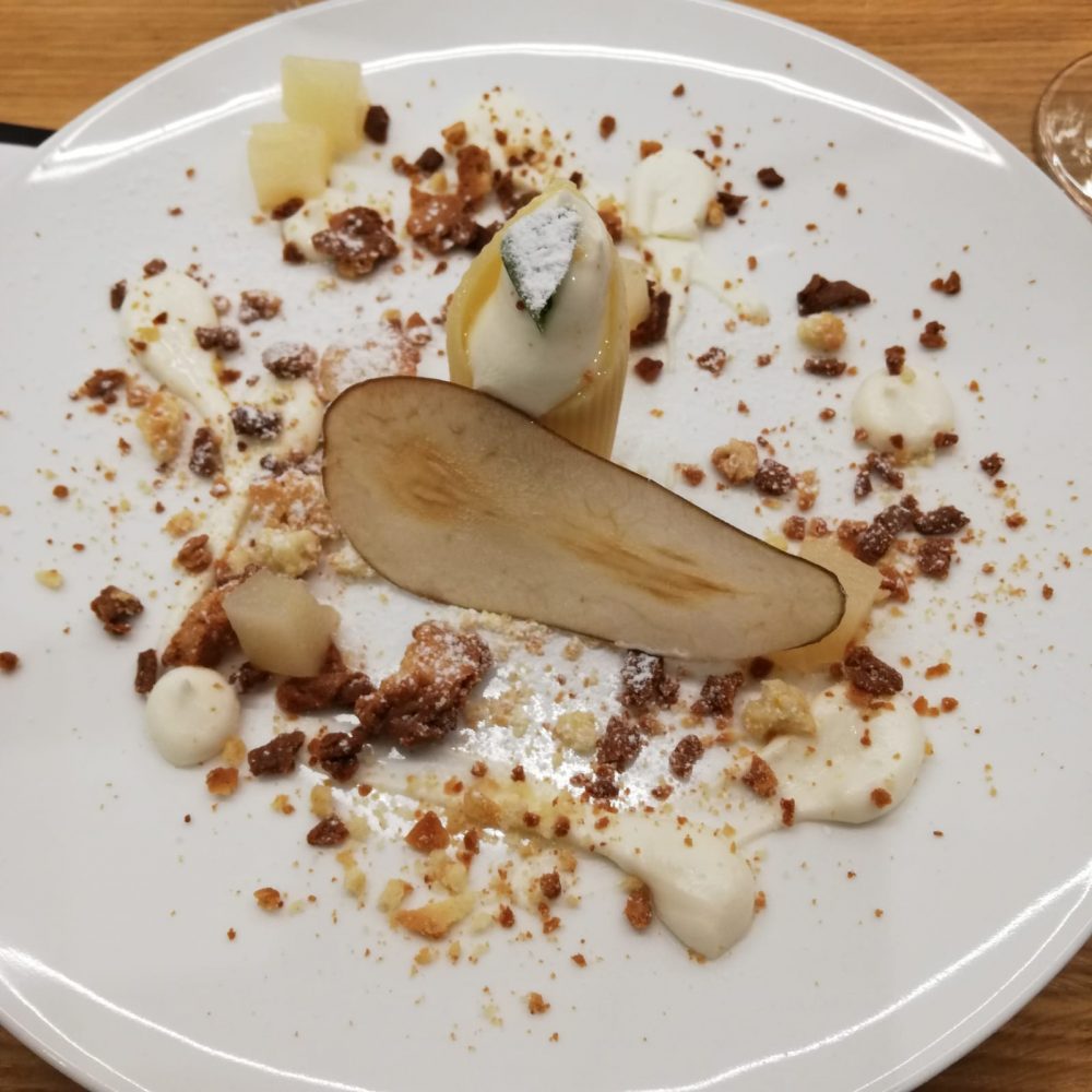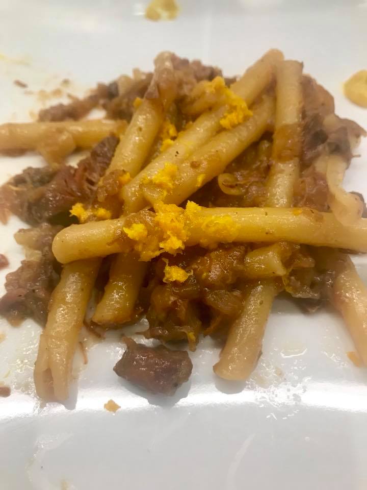 I mezzani spezzati alla genovese di anatra all’arancia è stato il piatto rivelazione della serata; le tendenze dolci dell’anatra e della cipolla di Montoro caramellizzata si esaltano con la salsa di pasta d’arancia e le zeste grattugiate fuori fuoco che rifiniscono la portata. Il risultato è una forchettata succulenta, saporita e fresca insieme, con la nota lunga dell’agrume che apre la strada alla forchettata successiva.