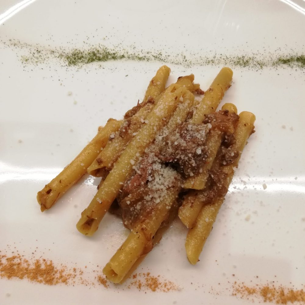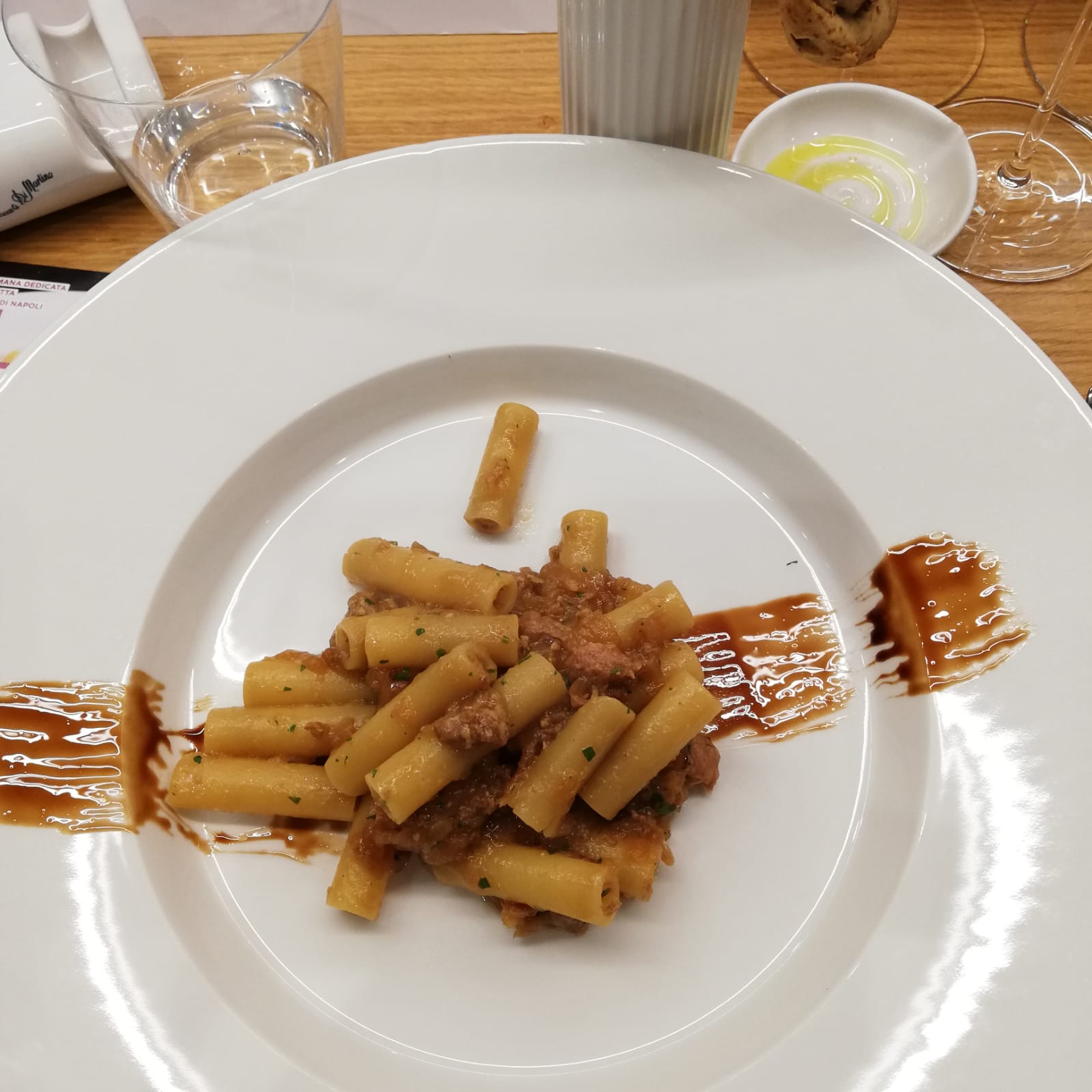 Oltre all’incrocio franco-partenopeo Pierpaolo Giorgio, coadiuvato da Gianluca Pisacane, ha proposto in un’indovinata sequenza un assaggio di Frittat ‘e maccarune con finta genovese (senza carne) e fonduta di pecorino; Zitoni tagliati lisci alla genovese di tonno, impreziositi da una pennellata di riduzione di aceto balsamico, il classico Ziti spezzati alla genovese con un tocco di farine di carote e sedano, la Devozione, imperdibile forchettata di spaghetti al pomodoro e chiusura dolce con Bombardone ricotta e pera e una selezione di piccola pasticceria.