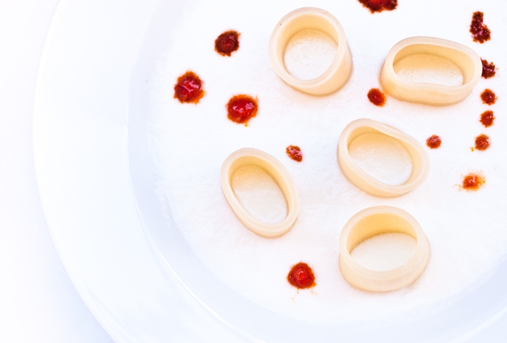 Comporre il piatto disponendo sul fondo la crema di mozzarella, decorare con la salsa di pomodoro che creerà un contrasto netto e intenso e completare infine con la pasta.