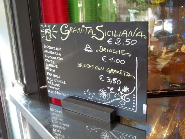 Qui, invece, c’è molta più Sicilia. Brioche con tanti gusti di granita. Ottima quella di mandorle e di pistacchi, che trovate tutto l’anno. Imperdibili quelle di gelsi neri e di fico d’India. La pasta della brioche ha una bella lievitazione ed è buona anche assoluta.