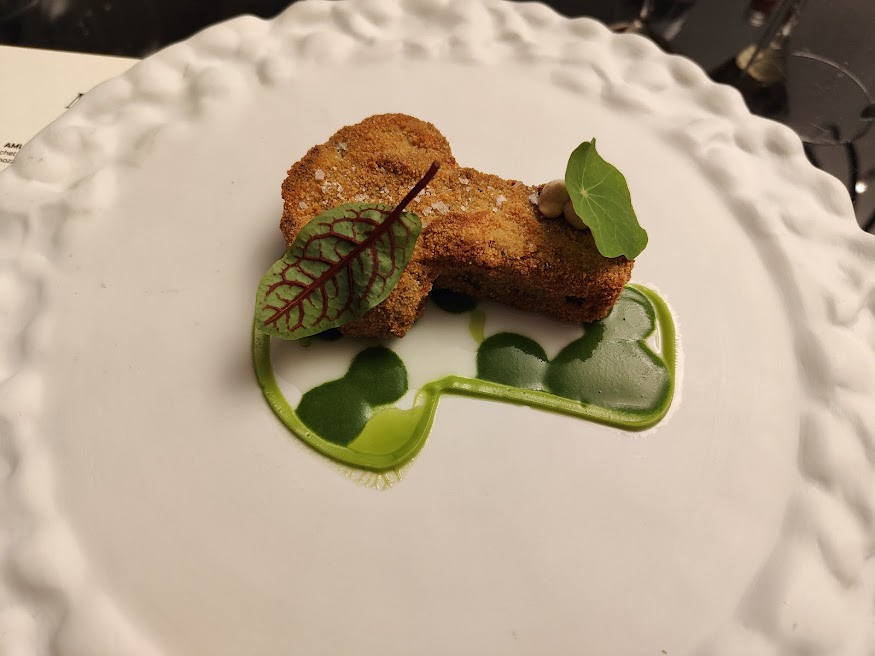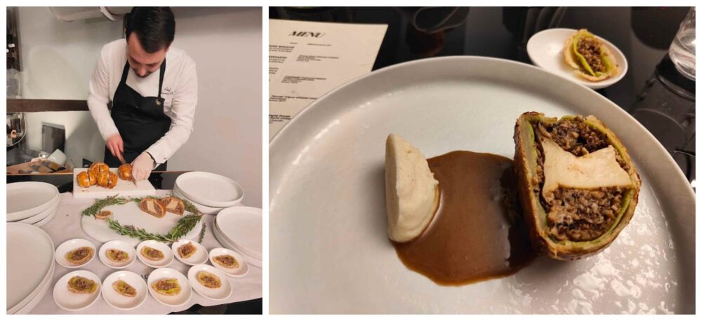 Due sale accoglienti per un totale di 40 posti, quella vista strada – con un dehor esterno per 12 coperti – e la sala cantina, una sorta di privè per piccoli gruppi ed eventi conviviali. In carta tanto territorio, un’attenzione particolare verso l’utilizzo e la lavorazione degli ortaggi e dei vegetalicome il fungo presentato in una succulenta versione cotoletta e in formato Wellington, con una purea di sedano rapa che è il valore aggiunto dell’inaspettato piatto.