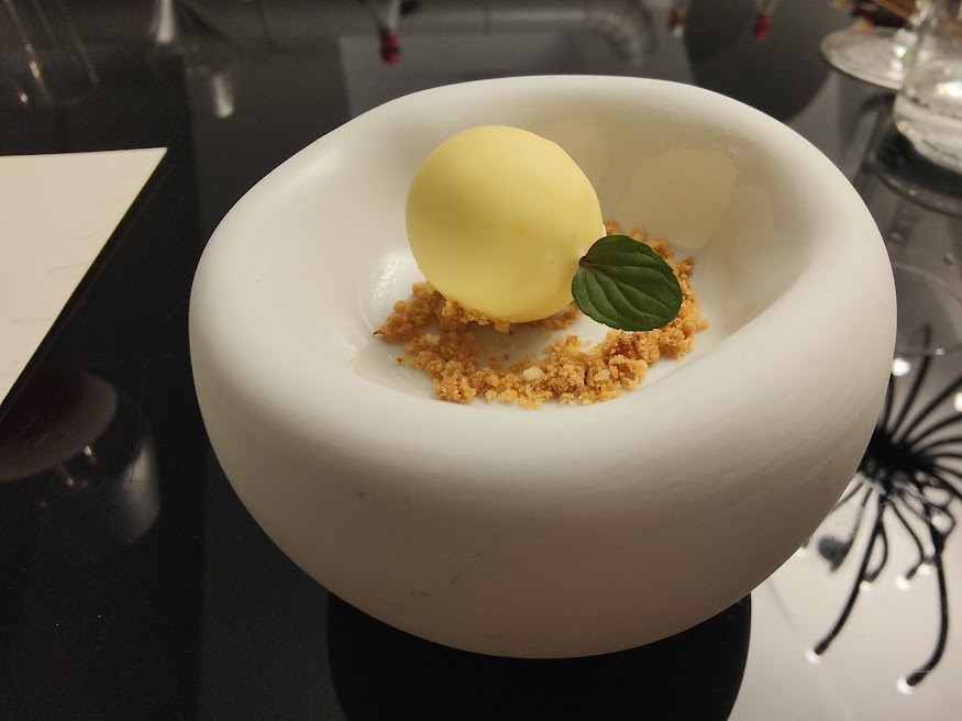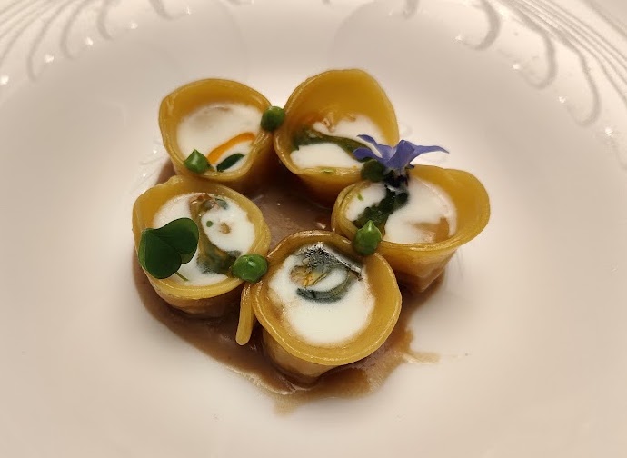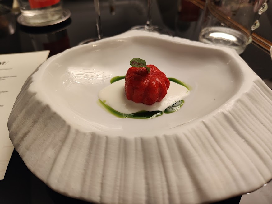 Ma veniamo intanto alla location, dove nulla è lasciato al caso e dove anche nell’arredo c’è un intreccio tra modernità e classicità, con tavoli ampi (per un totale di soli 30 coperti) e comode sedute, che esaltano la mise en place “nuda” e il tableware ricercato, con accessori che accentuano ancora di più l’esperienza gastronomica e culturale, visto che nei piatti si riassumono molti aspetti della storia del popolo partenopeo in particolare, e campano in generale.