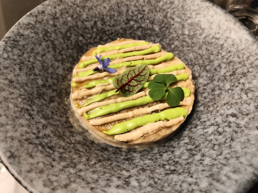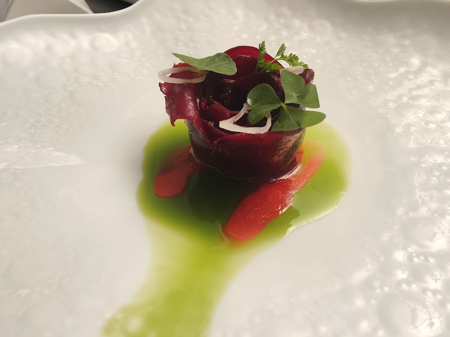 Per i vegetariani: porro fondente in alga nori, dressing agli agrumi, alioli e mayo al basilico e carpaccio di barbabietola affumicato, lampone fermentato e cipollotto croccante, e ancora Carpaccio di manzo affumicato, salsa di lampone fermentato e cipollotto croccante, Cotoletta di funghi, bagnetto verde, salsa aglio dolce e mayonese ai funghi, Capelletto al ragù napoletano, salsa di pane cafone, provola affumicata e mayo al basilico, per i vegetariani: risotto con variazioni di porcino. Particolare il secondo con Wellington di fungo cardoncello, purea di sedano rapa e jus di funghi.