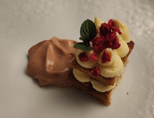 Come pre dessert la Panna cotta al limone su crumble al limone prima della Millefoglie con crema diplomatica alla vaniglia, lampone liofilizzato e zabaione al lampone. Per i vegetariani tiramisù vegano, savoiardo di riso, polvere di porcini e gelato al ginseng.