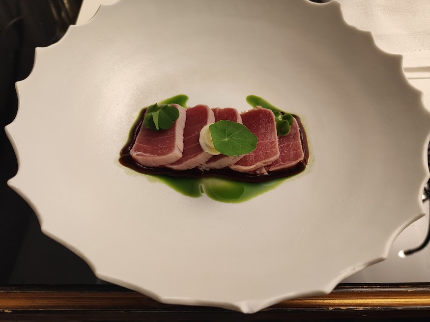 Disponibili poi piatti à la carte tra proposte di mare, terra e ovviamente piatti veg, senza glutine e lattosio per venire incontro alle esigenze nutrizionali degli ospiti. Nel menu autunnale/invernale, tra degustazione e carta e nell’attesa dei piatti esclusivamente natalizi troviamo l’amuse bouche Bruschetta e colatura di mozzarella di bufala, il Tonno tataki, dressing agli agrumi, alioli e mayo al basilico.
