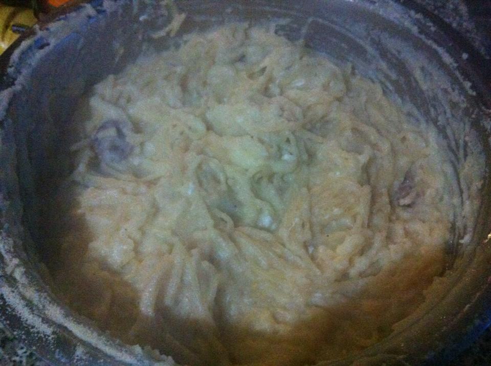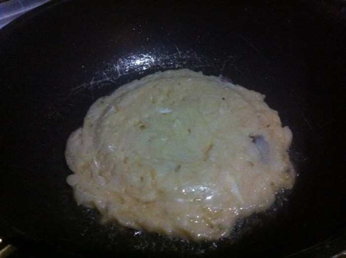 Lasciar a riposo 5 minuti, dopodiché aggiungere 5 uova e girare il composto.
