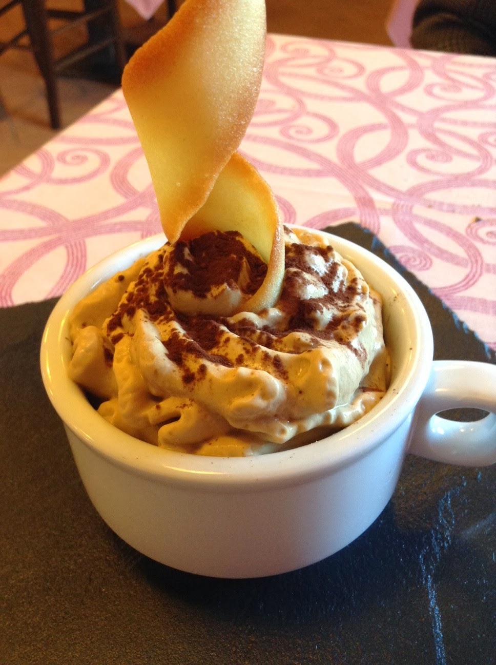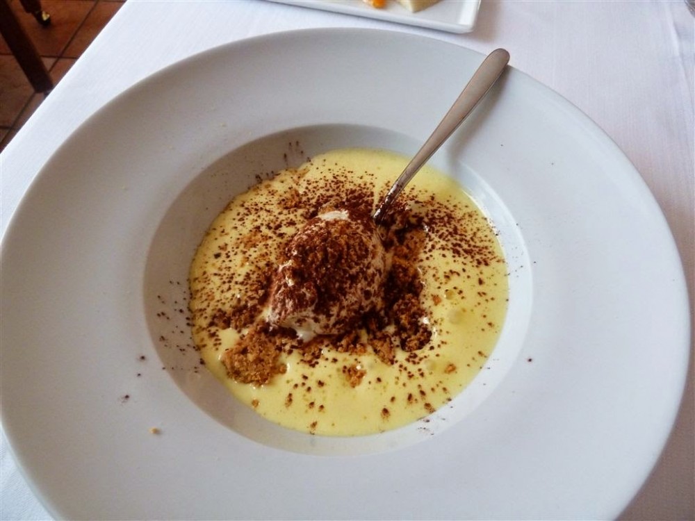 Cucina Cereda, Ponte San Pietro, Passaggio Toscanini, in un bellissimo contesto, spuma tiepida al mascarpone gelato al caffè e sbrisolona
