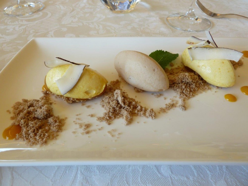 Antica Osteria dei Camelì, Ambivere, zuccotto alla vaniglia, nella zucca è nascosto un sorbetto di cioccolato extrafondente, a guarnizione e contrasto, tipeida crema all’arancia