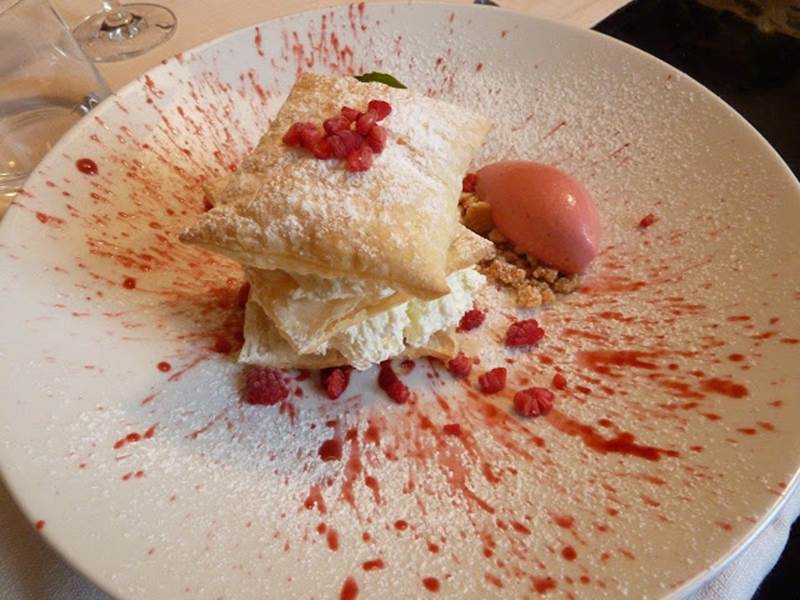 Rosso di sera, Castelletto Ticino, non solo risotti dai fratelli Gramegna, ecco una millefoglie con crema Chantilly e salsa ai lamponi
