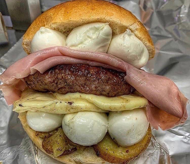 Fratacchione ormai è un vero e proprio “mood”, anche per i panini. Hamburger di scottona, parmigiana bianca, provolone piccante, pancetta rotolata al pepe e pesto di pistacchio.