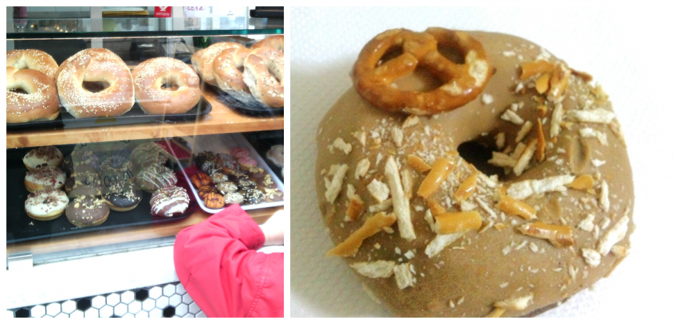 In foto: La vetrina delle ciambelle – Ciambella base cacao con glassa al caramello e pretzel