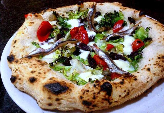 C’è sopra la scarola riccia, il pomodorino del piennolo, l’ oliva caiazzana, il cappero di Salina, la burrata di bufala, le alici di Cetara.