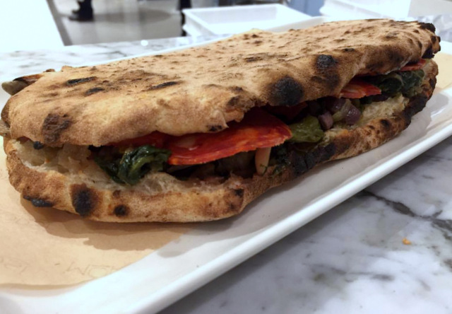 È così il suo calzone Aria ‘e mare farcito con ricotta di fuscella di bufala, ricciola affumicata, zeste di arancia di Massalubrense, alga di mare disidratata e pepe.
