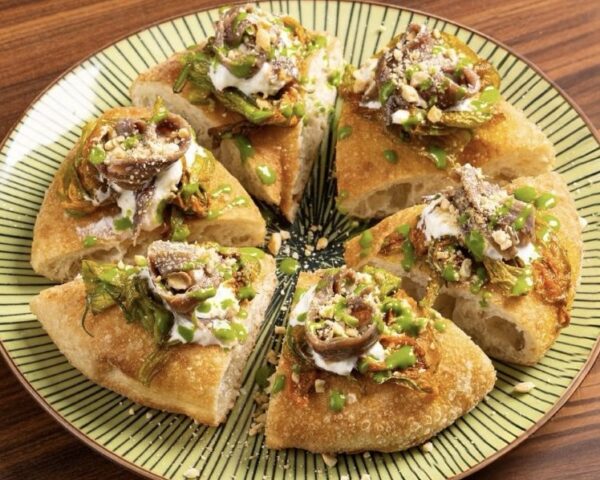 Lievito madre, farine di germe di grano vivo macinato a pietra, lievitazione lunga (da 72 a 96 ore): con queste premesse – e qualche trucco come le piccole aggiunte di crusca, farro e soia nell’impasto – si prepara il “letto” per le materie prime del territorio (caciocavallo di Ciminà, pomodorini secchi, ‘nduja di Spilinga) felicemente sposate a bufala Dop, burrata e stracciatella salentine ma anche tartufo di Norcia e lonza della Cinta senese.