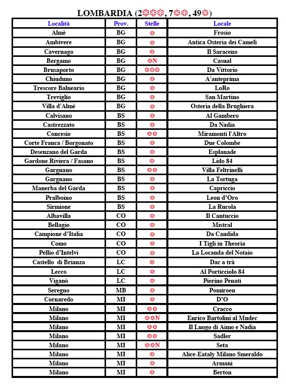 Ecco le stelle Michelin per la Lombardia nell’edizione 2017. Conferma dei 2 ristoranti con 3 stelle: Da Vittorio a Brusaporto e Dal Pescatore a Canneto sull’Oglio. Ben 7 ristoranti con 2 stelle e 49 con 1 stella.