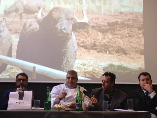 Fratelli La Bufala a Milano, da sinistra l’Amm. delegato Paolo Aruta, lo Chef Fabio Bisanti, il pasticciere-attore Germano Bellavia, il dott. Renato Rocco