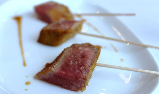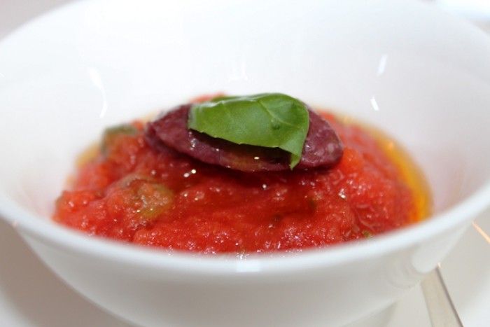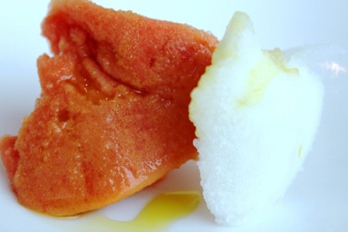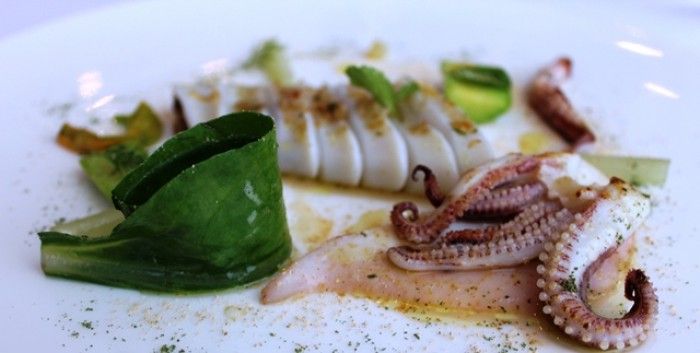 Ad intervalli più o meno regolari si avvicina al tavolo e racconta cosa mangiamo e da dove vengono le materie prime. Ed ecco che comincia il racconto si passa dalle mandorle di Noto, ai limoni della costiera sorrentina, al pesce della Liguria, al rapporto da oltre quarant’anni con lo stesso macellaio piemontese, dal farro della Garfagnana fino ai capperi di Pantelleria. Sembra di essere sulle montagne russe, si sale si scende si torna a salire e poi a scendere.