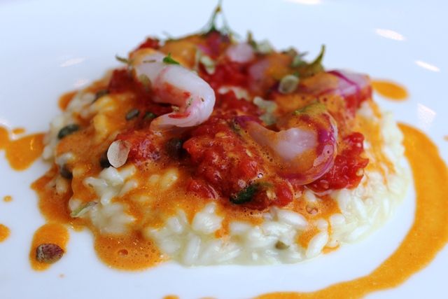 Risotto Carnaroli mantecato all olio di olive Nocellara con gamberi liguri pomodori di Pachino origano e capperi di Pantelleria