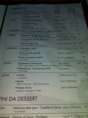 Carta dei vini. Le etichette sono una cinquantina in tutto: bei nomi, per carità. Manca, a mio avviso, un po’ di coraggio e di coerenza con la proposta gastronomica (anche se – è bene dirlo – il menù cambia con le stagioni e, quindi, alcuni vini oggi fuori contesto potrebbero non esserlo con il menù invernale), e comunque, in generale, poco adatti al tipo di cucina. Il concept stesso del locale richiederebbe (forse) qualche campano in più, tipo il fiano e (di sicuro) una maggiore rotazione per i vini al calice, magari affidandosi alla cara vecchia lavagna per le proposte alla mescita, così da poterle meglio calibrare in base alla stagionalità del menù. I ricarichi – e questa è la nota dolente – sono importanti. Prendiamo i campani: una bottiglia di falanghina costa 23 euro cioè quasi 5 volte il prezzo di acquisto per un ristoratore, un calice della stessa falanghina più o meno quanto una bottiglia (secondo lo stesso ragionamento di prima). Il greco di tufo e il fiano di avellino costano rispettivamente 25 e 26 euro ma non è specificato se si tratti delle versioni “base” o – leggendo sul sito – dei crus “Cutizzi” e “Pietracalda” (in quest’ultimo caso ci potrebbe pure stare). A proposito di sito: i prezzi dei vini non corrispondono. Premesso che non c’è e-commerce, la stessa falanghina costa “dal vivo” 23 euro, 17 sul sito.