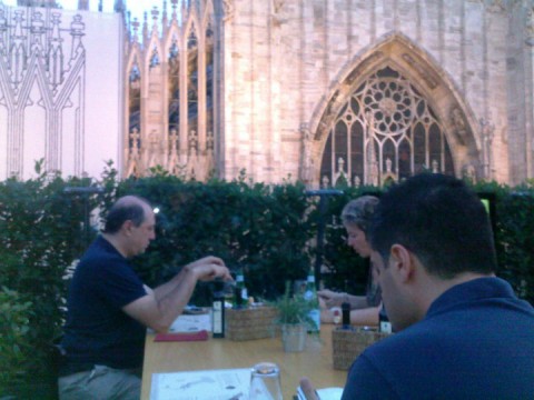 A differenza degli altri due, però, il mozzarella bar de La Rinascente regala (nel senso che non c’è sovrapprezzo) la possibilità di consumare all’aperto, sulla terrazza vista-Duomo, appena qualche metro più in giù della madunina. Ed è (soltanto) questo il motivo per cui ci sono ritornato due sere fa. Ci si accede proprio dai magazzini ma il mio consiglio è di evitare il percorso interno se, come nel mio caso, siete in dolce compagnia (il rischio è quello di perdere ore tra il piano “abbigliamento donna” e “casa”). Meglio utilizzare l’ascensore che sale diretto al 7° piano: lo si prende sul lato destro dell’edificio, in via Santa Radegonda, e in venti secondi (sì, in effetti è un po’ lento) siete su.