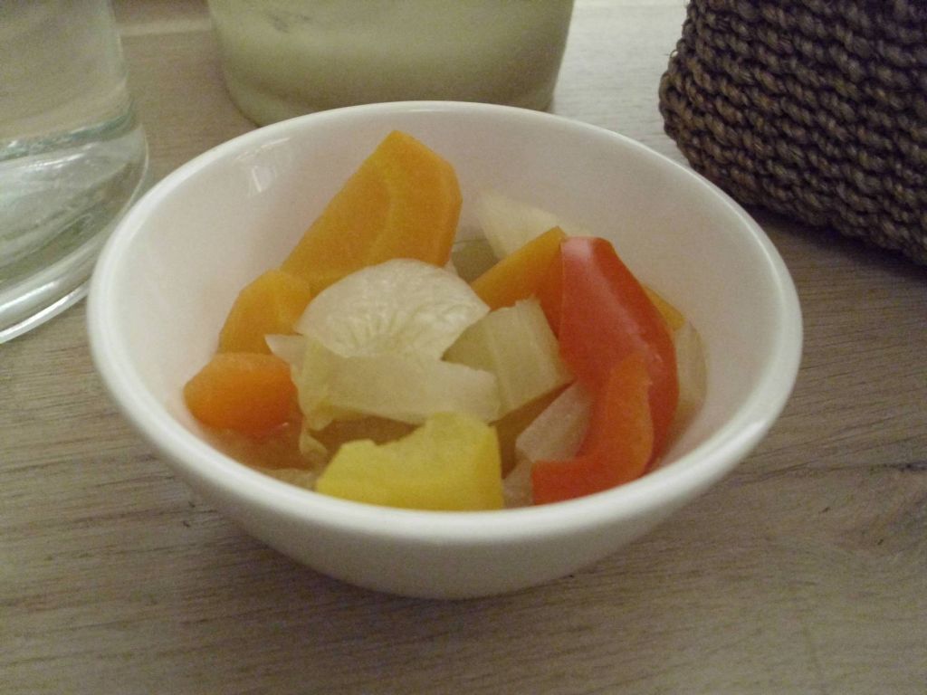 Viene servita come assaggio assieme a una mezzasfoglia al parmigiano reggiano 24 mesi (fornito dal caseificio Pratichiera di Fontevivo, Parma), alla giardiniera “vera” e a una ciotola di delizioso cavolo cappuccio.