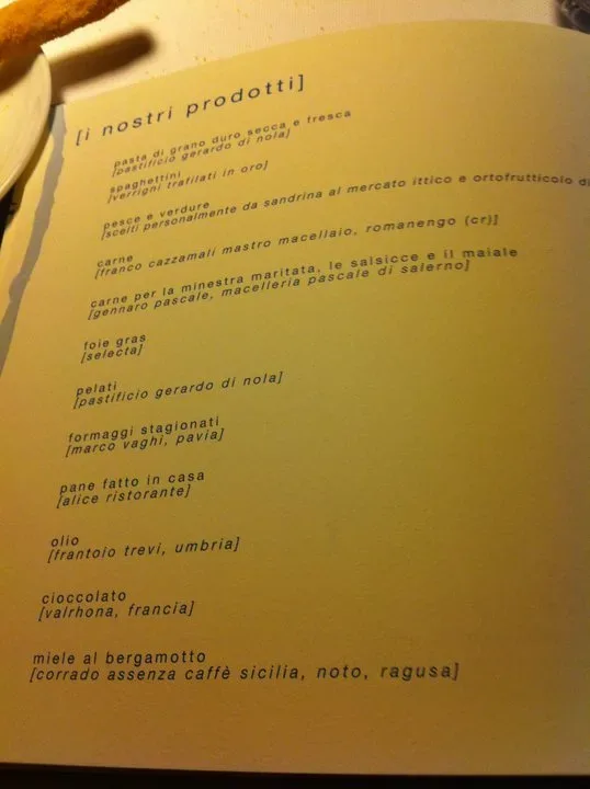 Alice, I prodotti 20/2/2011 Torna a: Milano, ristorante Alice di Sara Ciciriello e Viviana Varese Alice, sul menu la provenienza dei principali prodotti. Di Selecta solo il foie grasSuccessiva →