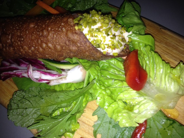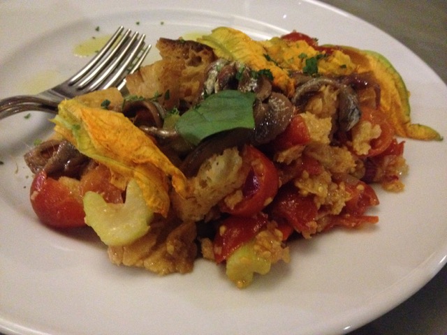 Qui si parla di prodotti a km VERO, i produttori sono legati infatti al territorio e utilizzano metodi di produzione etici, sostenibili e biologici.Ordiniamo una panzanella come antipasto, buona e fresca, ci stuzzica l’appetito.