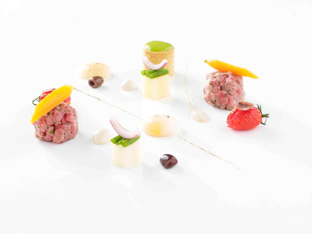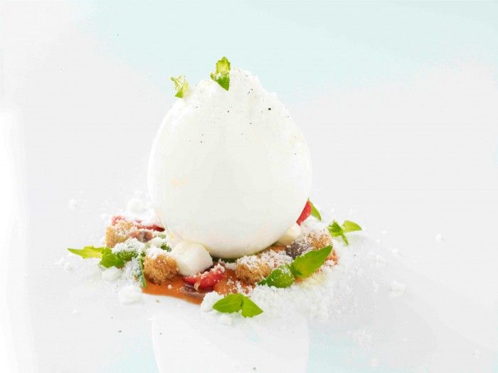 Una mozzarella nascosta all’interno di un fragile guscio di una perlacea cupola di zucchero caramellato, su coulis di pomodorini del Vesuvio, crostini di pane casereccio, datterini appassiti, filetti di acciughe di Cetara e con emulsione di pesto al basilico. Una goduria infinita, in cui gli ingredienti fanno a gara per emergere singolarmente, ma alla fine quella che vince è la “squadra”. Altra entrée: battuta di fassona, nizzarda e salsa verde.