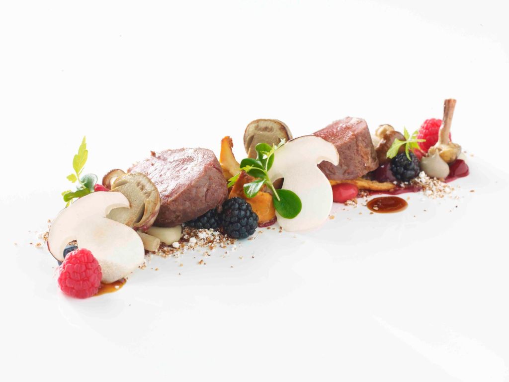 Ecco qui, a mio giudizio, il miglior piatto del pranzo, molto sostanzioso e papilloso. Una cottura lenta e laboriosa fa risaltare il gusto morbido e succoso della faraona, che impegna la bocca con paradisiaca piacevolezza. Ultimo secondo: cervo, bosco e sottobosco.