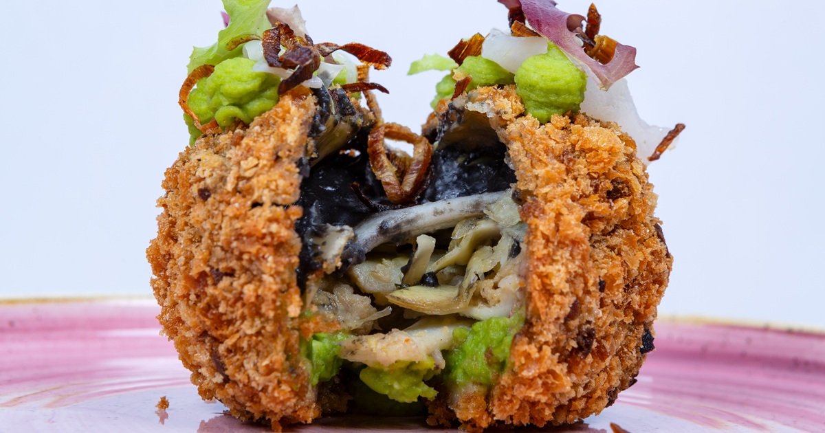 All’interno di uno stampo, creare una struttura compatta alternando strati di crema di piselli, carciofo alla romana, striscioline di seppia e besciamella al nero di seppia e pecorino, ottenendo una millefoglie. Panare dapprima in una pastella leggera e poi nei fiocchi di pane tostato. Friggere.