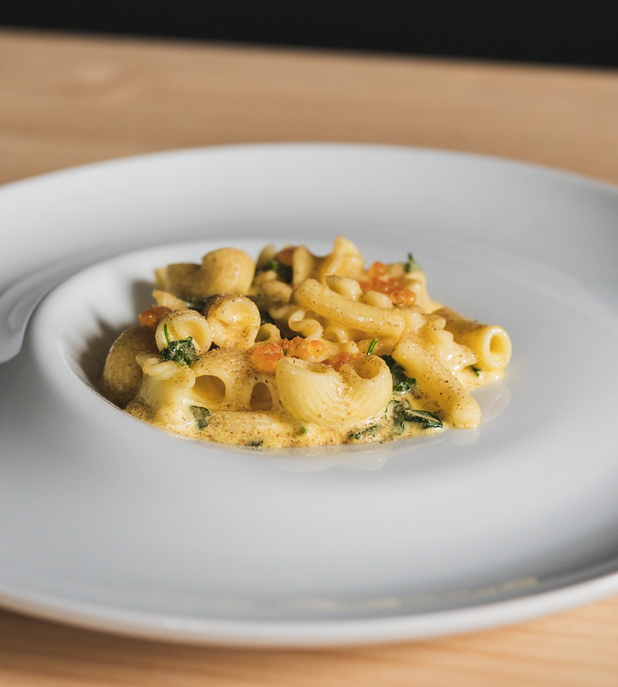 Questa ricetta nasce dall’idea di Manuel di inserire un piatto di pasta fredda in un percorso di degustazione legato al suo territorio d’origine, il “territorio laghee” (territorio di lago), esaltando il concetto di estate italiana e delle tradizioni ad essa legate.
