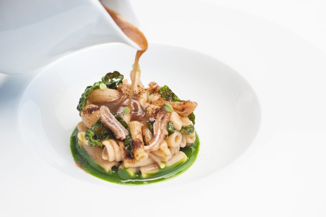 Jakopo Simone, chef di Gioja Ristorante ad Altamura, partecipa al Primo Piatto dei Campi 2019, iniziativa siglata LSDM e Pastificio dei Campi, con Mischiato Potente, cavolo nero, orecchio di maiale e salsa di cipolle cotte in brodo di pane.