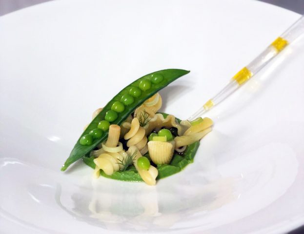 La preparazione evoca la pasta e piselli della nonna e le giornate trascorse, da piccolo, nel suo ristorante a sbucciare i piselli freschi, divenuti compagni di gioco del momento. Antonio li ripropone in una versione “sperimentale” e rinnovata per accostamenti e contrasti, in pieno accordo con la sua filosofia di cucina.