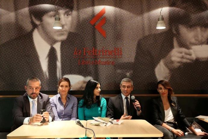 mymusic coffee, i relatori durante la presentazione a Milano. Da sinistra: Alberto Tarakdijian, direttore librerie Feltrinelli, Silvia Granata, direttore marketing Gruppo Feltrinelli, Annalisa Spadola, direttore marketing Caffè Moak, Alessandro Spadola, direttore generale Caffè Moak e Paola Maugeri, curatrice progetto musicale Caffè Moak