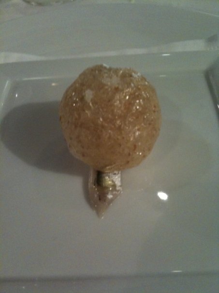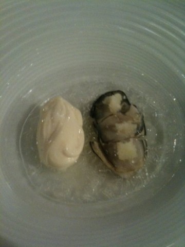 ALASKA: lastra sottilissima di ghiaccio(e sembra un Venini 1940) con sopra una maionese leggerissima di profumi marini, un’ostrica grassa ed emozionale ed una granita di zenzero, dolce.