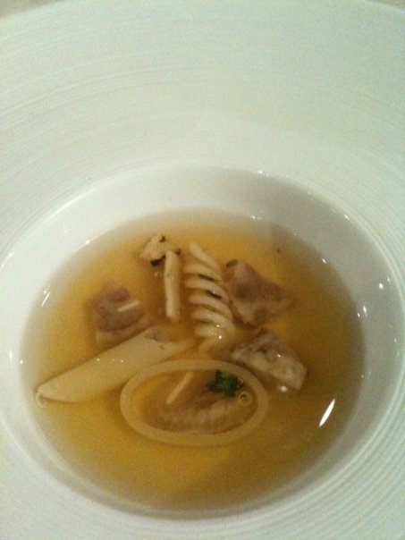 Componenti: avanzissimo di dispensa: 1 fusillo, 1 pennetta, 1 parte di calamaro (pasta) in brodo con gli avanzi di una testina di vitello, timo, finocchiona e arancia. Un gioco di recupero. Roba dei tempi della guerra. Gli equilibri sono saldi e garantiti. Massimo è innamorato di questo piatto. Non ho il coraggio di dirgli che lo trovo ottimo ma in linea con altre sue meraviglie e non oltre.