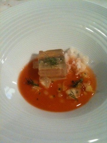 SGROMBO IN GELATINA, GHIACCIO DI ZENZERO PICCANTE, BRODO DI AGRUMI
