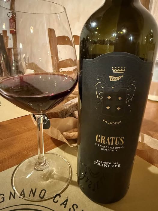 Capitolo vino, carta locale, pesco, quasi a caso un magliocco, che non conosco ma mi ispira il nome della cantina: Farneto del Principe, Gratus 2024. Mamma mia che meraviglia, scordatevi legno, cuoio, qui abbiamo spezie, frutti rossi non maturi, con una elegantissima chiusura balsamica. Ne facciamo fuori due bottiglie, e provo anche a comprarne prima di partire ma trovo la cantina chiusa. Peccato.