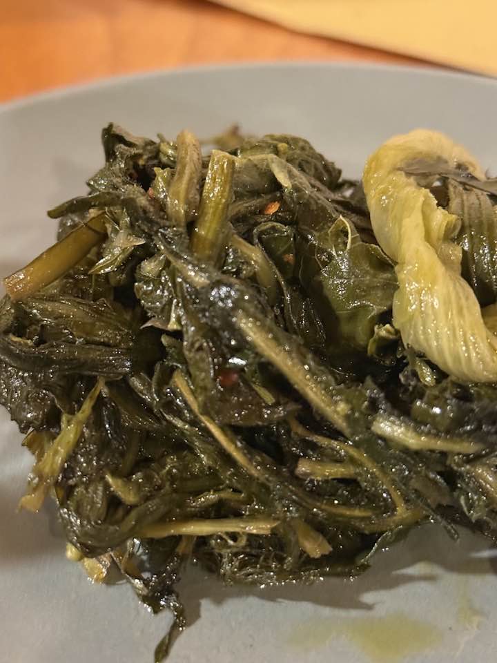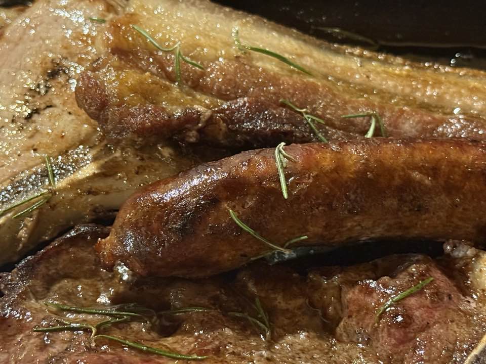 Costoletta e pancetta ottime, la materia prima è molto buona e si nota dalla scioglievolezza del grasso, suadente. La pancetta della grigliata ha ancora la cotenna, che può risultare gommosetta alla masticazione e quindi, sarebbe meglio togliere, la salsiccia saporita ma un po’ asciutta, magari un po’ più di grasso nell’impasto avrebbe aiutato. Cicoria di accompagnamento, perfetta. Nel complesso, una bella esperienza di degustazione di carne di suino nero di Calabria, alla griglia, con la costoletta davvero sublime, nella sua voluttuosa grassezza.