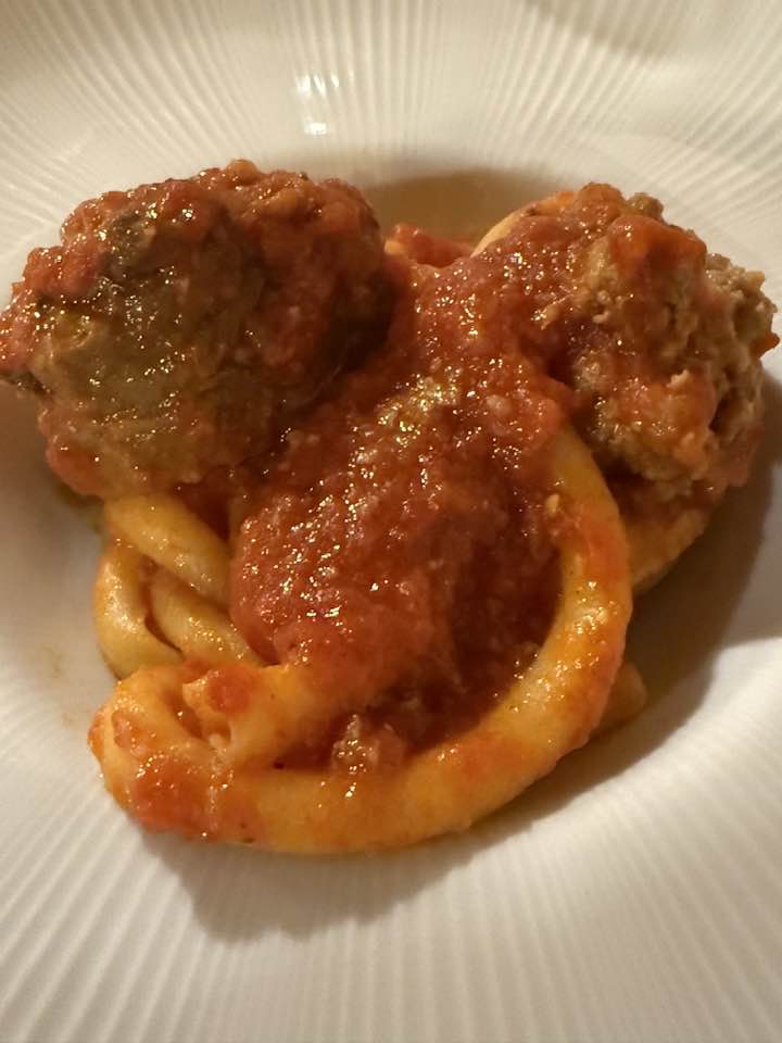 Questo magliocco sta una meraviglia con il primo, fusillo di grano antico con polpettine e braciole, che Luigi, da maitre esperto, fa servire già divisa in due piatti la porzione singola che io e Rossana prendiamo per assaggiare, e con la grigliata di suino nero, che prevedete costoletta, salsiccia e pancetta. Qui perdiamo due secondi, e raccontiamo con qualche appunto tecnico.