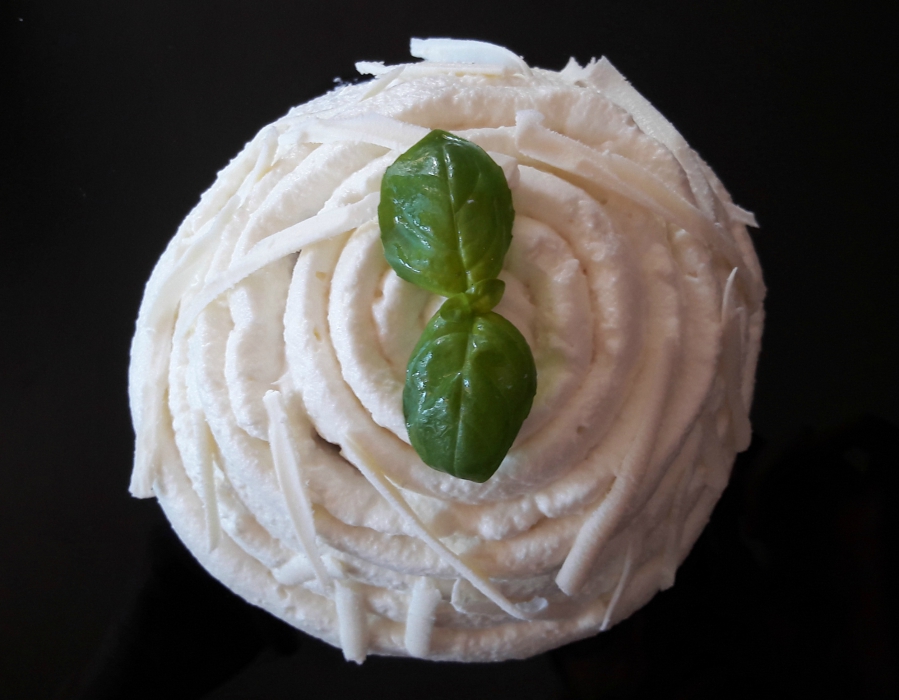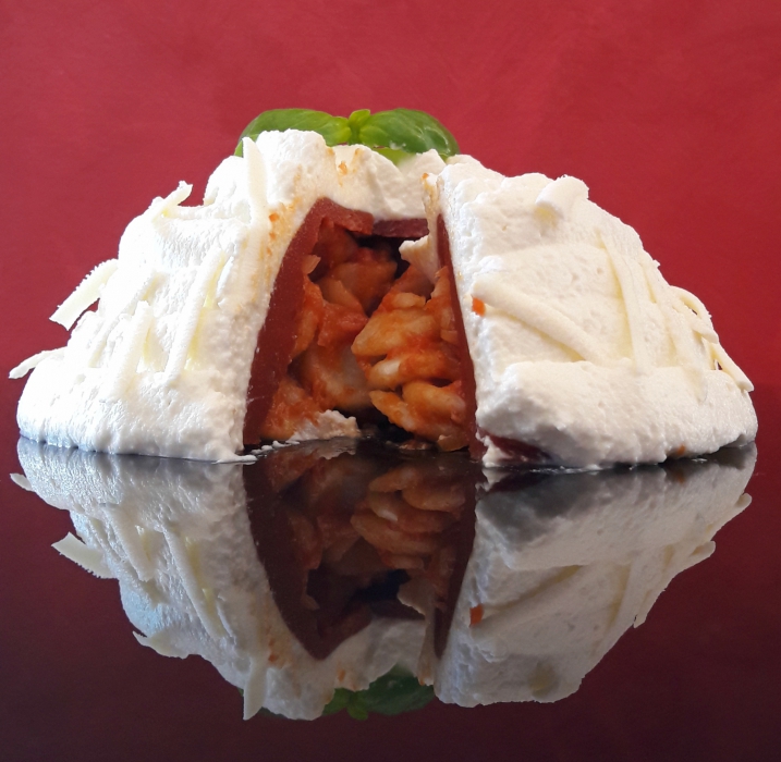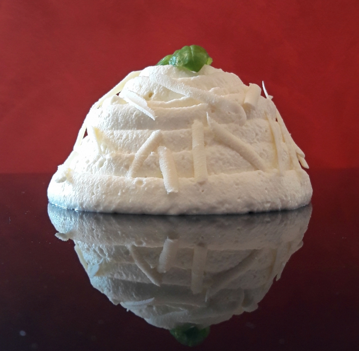 La versione originale prevede una cupola di orecchiette condite con un sugo di pomodoro ricoperte poi da una copiosa grattuggiata di cacioricotta pugliese, quella mista pecora/mucca, fino a ricoprire l’intera portata creando appunto l’effetto monte bianco, nella mia versione invece, la cupola la costruisco gelificando del sugo di pomodoro con l’agar agar e raffreddandolo in una ciotola con all’interno una seconda ciotola più piccola in modo da creare una montagnola cava, poi la riempio con le orecchiette, la ribalto sul piatto di servizio e la ricopro con una crema di ricotta e cacioricotta dressata col sac a poche e delle scaglie di cacioricotta a decorare i pendii, un ciuffo di basilico completa il piatto.