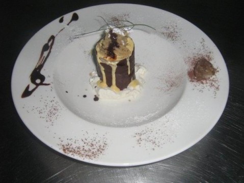 In un piatto fondo disponete un cucchiaio di panna, adagiate al centro la cialda e riempite alternando con crema e maron-glace sbriciolati, coprite il tutto con lo zabaione caldo ben montato. Decorare con zucchero a velo, cacao e spaghetti di marzapane alle castagne e riduzione di rum al cioccolato.