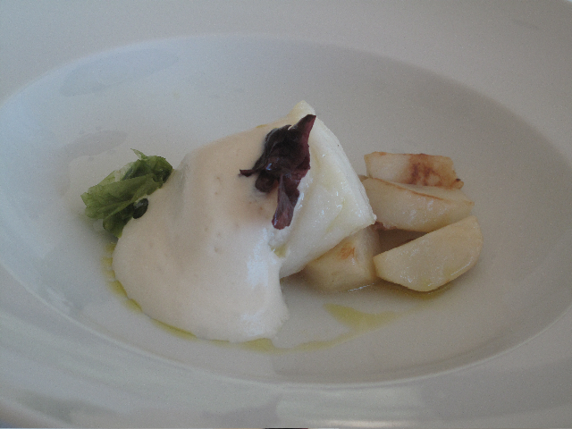 E uno stupendo BACCALA’ spagnoleggiante CON TOPINAMBUR, LATTE DI MANDORLE E ALGHE ALL’ACETO DI CHIANTI