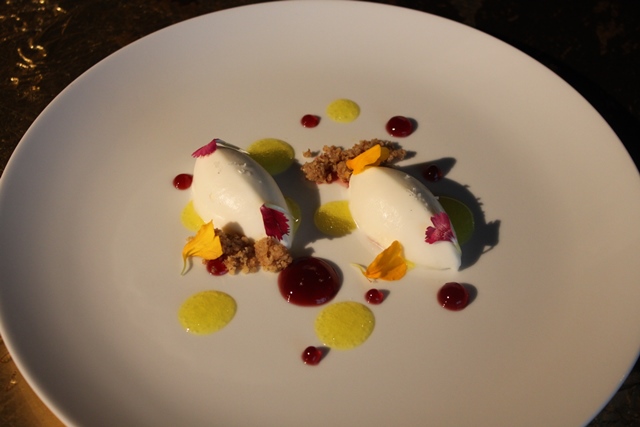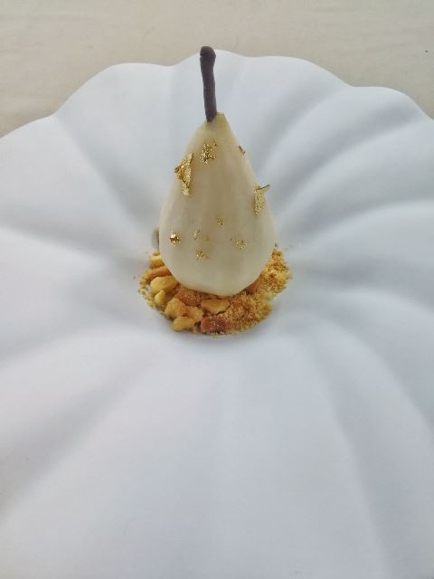 Poggio Le Volpi – Pera sciroppata al pepe bianco, ripiena di crema di latte e vaniglia, con cioccolato fondente, oro 24kt, pepe lungo su crumble affumicato al legno di ciliegio