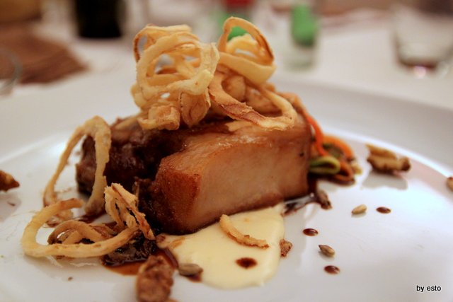 Cappello del prete, cottura confit con verdurine croccanti di stagione, noci tostate e chips di cipolla. Un bel trancio di spalla di maiale nero sannita. Saporito e simpaticamente glocal con il tempura croccante di cipolla, la crema di patate, i gherigli di noci, i semi di zucca e di girasole, la mostarda di peperone.