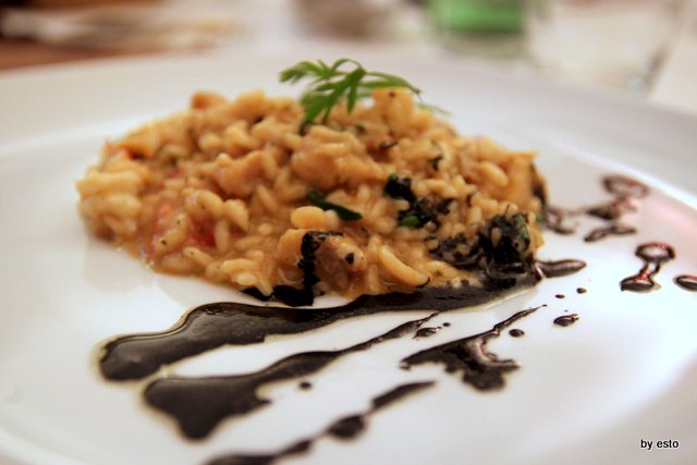 Risotto carnaroli mare al nero di seppia. Beh, qua la mano del cuoco ha lasciato fare alla sapidità dei mitili troppo vivi per starsene cheti e tranquilli senza esprimersi troppo. Ma la dolcezza dei gamberi ancora vivaci ha risolto il problema.