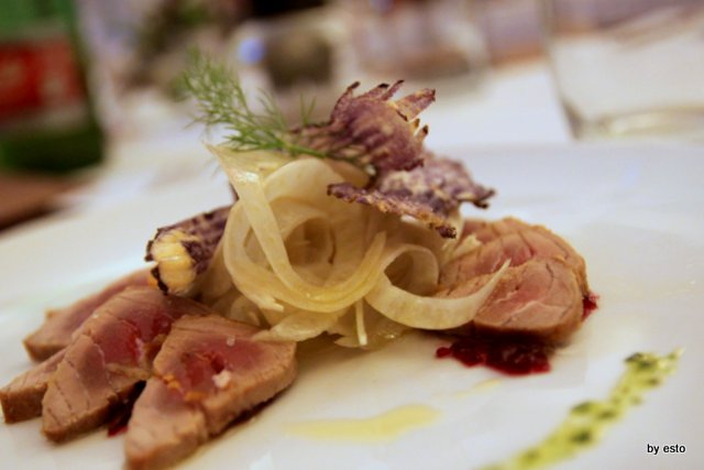 Il Tonno cotto a bassa temperatura aromatizzato alle erbe selvatiche, servito con crema di cipolla di Tropea. Ci sono i finocchi marinati con il limone, le cipolle candite in una dolce mostarda domestica, le patatine viola screziate di giallo (sono un clone sannita, ci svelerà lo chef). Un bel gioco di consistenze, buona acidità e tenue dolcezza, manca l’amaro: non è terra di Ravece, non è tempo di cicoria selvatica. Il tonno, roseo e umoroso, è di gran qualità, c’è una buona pescheria a Montesarchio, pensate! Un bel piatto d’entrata.