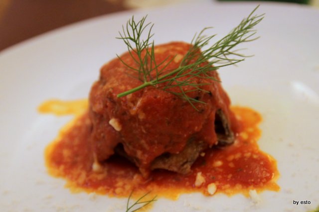 Il Timballo di melanzane con pomodoro ramato disidratato, mozzarella di bufala, crema di pomodoro del Vesuvio, pesto di basilico e prezzemolo. Piace.