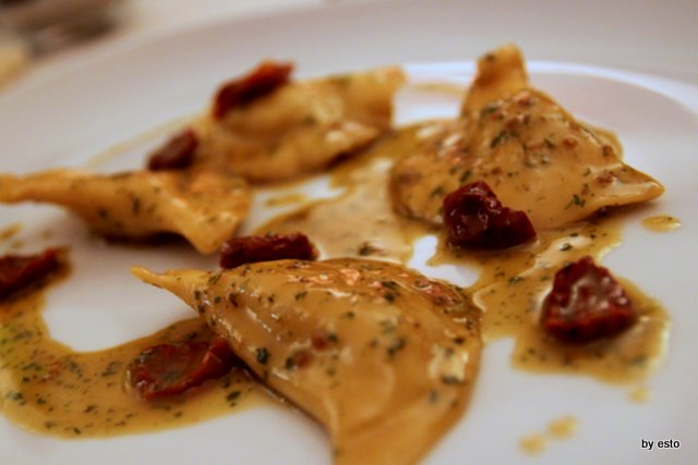 Agnolotto farcito di baccalà e pomodorino secco. Succulento anche questo. La sfoglia sottile all’uovo, scioglievole ne raccoglie gli umori e li accompagna al palato.
