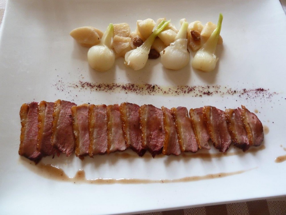 Petto d’anatra al forno con cipollotti glassati, pere e uvetta a completare e a risvegliare ricordi altoatesini e anticipazioni sul tema strudel che qui non teme rivali e chi scrive non teme smentita